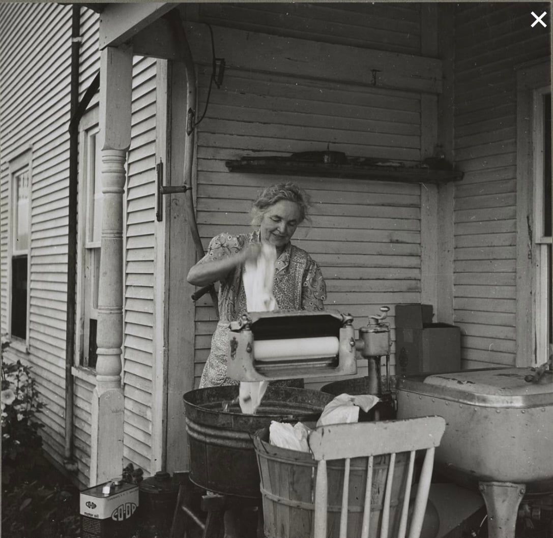 I remember my mother washing in a wringer washer in the 40’s, passing the clothes through the wringer from the wash tub to the rinse tub. I remember with horror the one time she caught her finger in the wringer! Though it had a quick release, it hurt, and the memory of my mother’s pain lingers still.